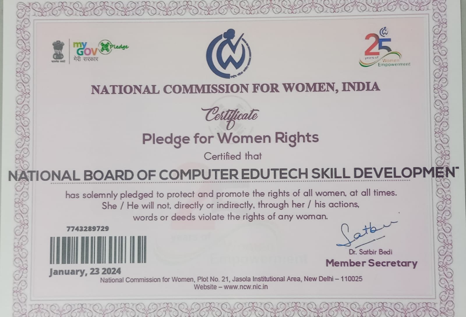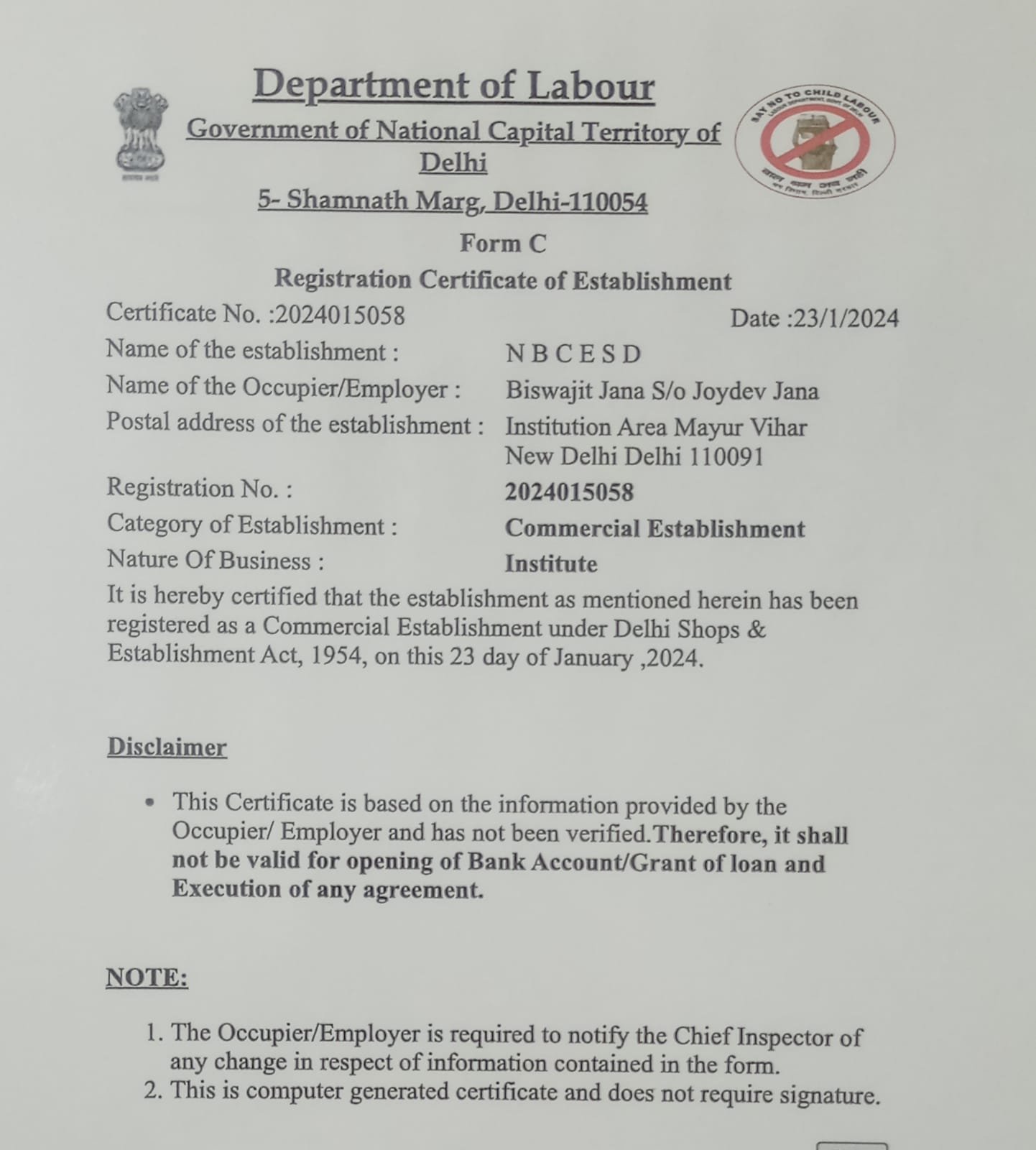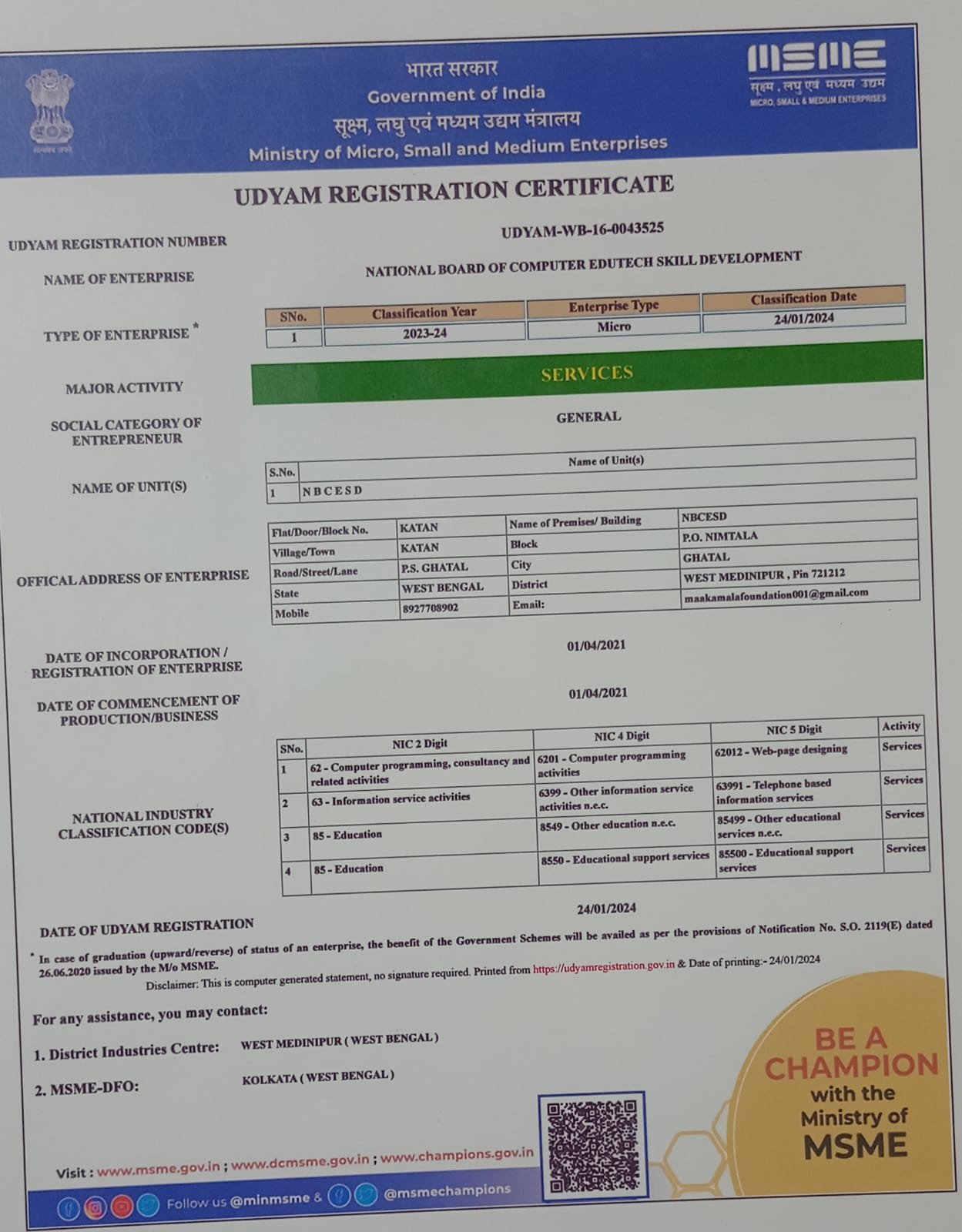 NBCESD is an autonomous organization registered under the Indian public trust act. A unit of 'National Board Of Computer Edutech Skill Development' (Unique ID.- IV-1902-01927/2023) and  N.CT. New Delhi Govt. of India. And the trust is also certified by  ISO 9001 : 2015 org (Certificate No.-QMS240112). The institute certificate is also registered under C.R.,Ministry of Human Resource Development Govt. of  India. And  Affiliated member of Planning Commission Govt. of India. The organization also certified by Department of Labour, Government of National Capital Territory of Delhi (Certificate No.- IN-DL31700138887805W)