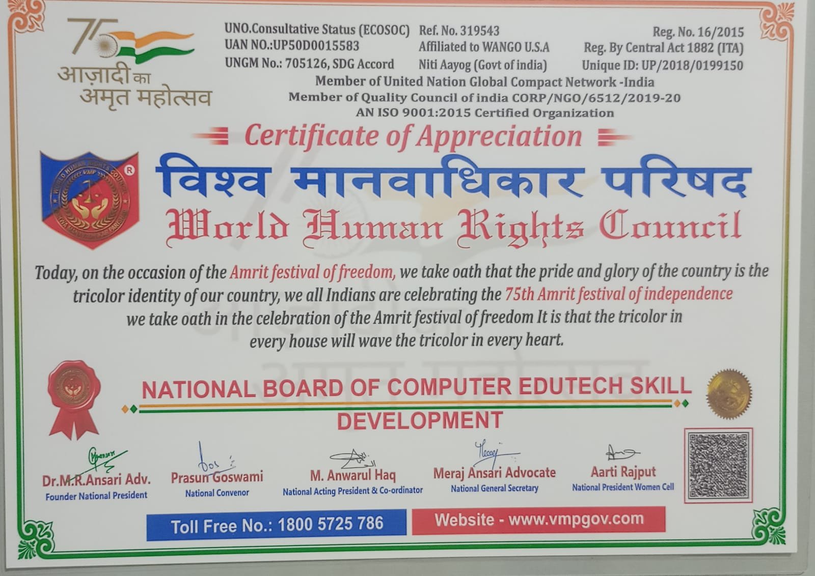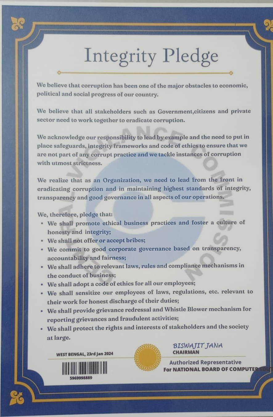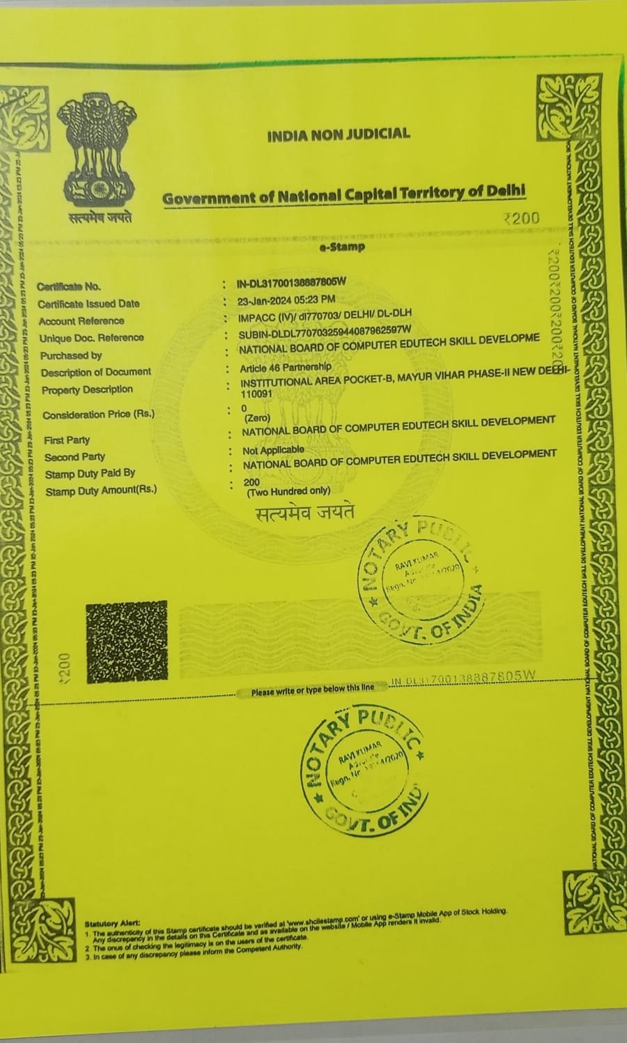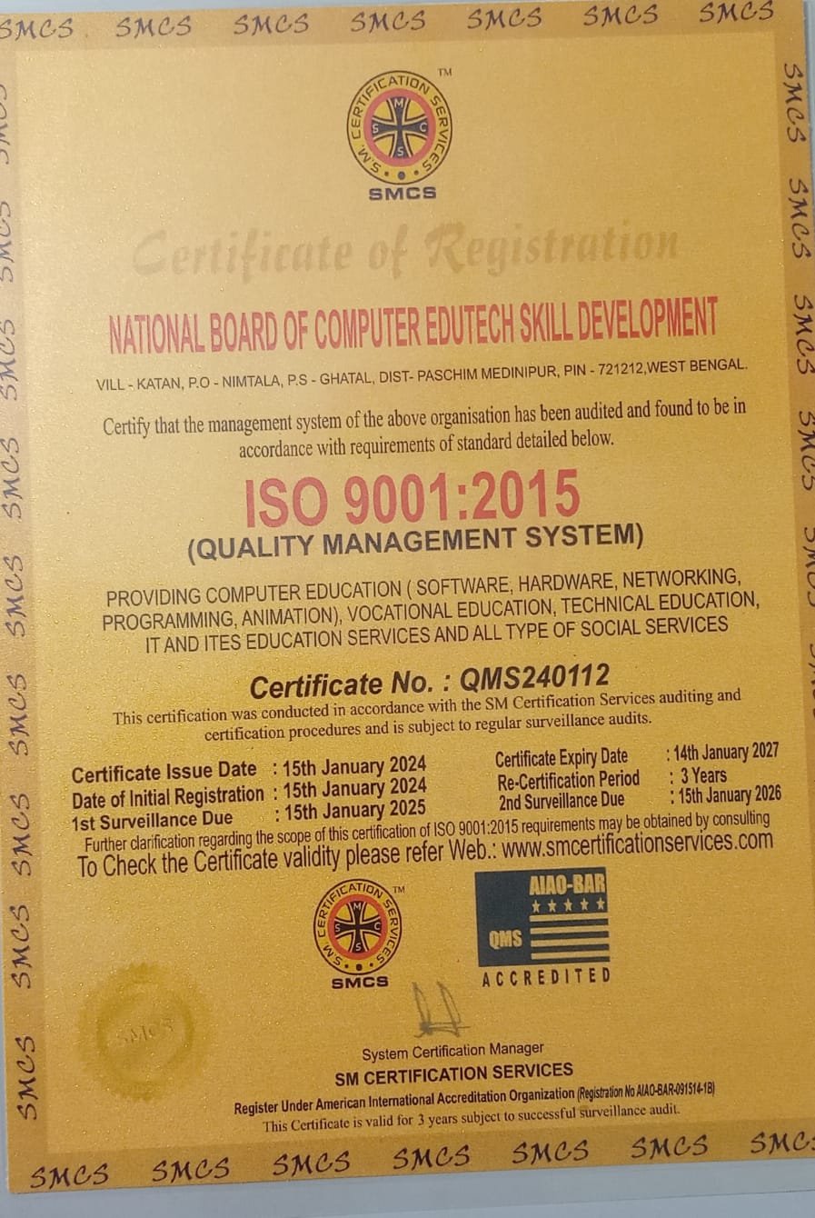 NBCESD is an autonomous organization registered under the Indian public trust act. A unit of 'National Board Of Computer Edutech Skill Development' (Unique ID.- IV-1902-01927/2023) and  N.CT. New Delhi Govt. of India. And the trust is also certified by  ISO 9001 : 2015 org (Certificate No.-QMS240112). The institute certificate is also registered under C.R.,Ministry of Human Resource Development Govt. of  India. And  Affiliated member of Planning Commission Govt. of India. The organization also certified by Department of Labour, Government of National Capital Territory of Delhi (Certificate No.- IN-DL31700138887805W)